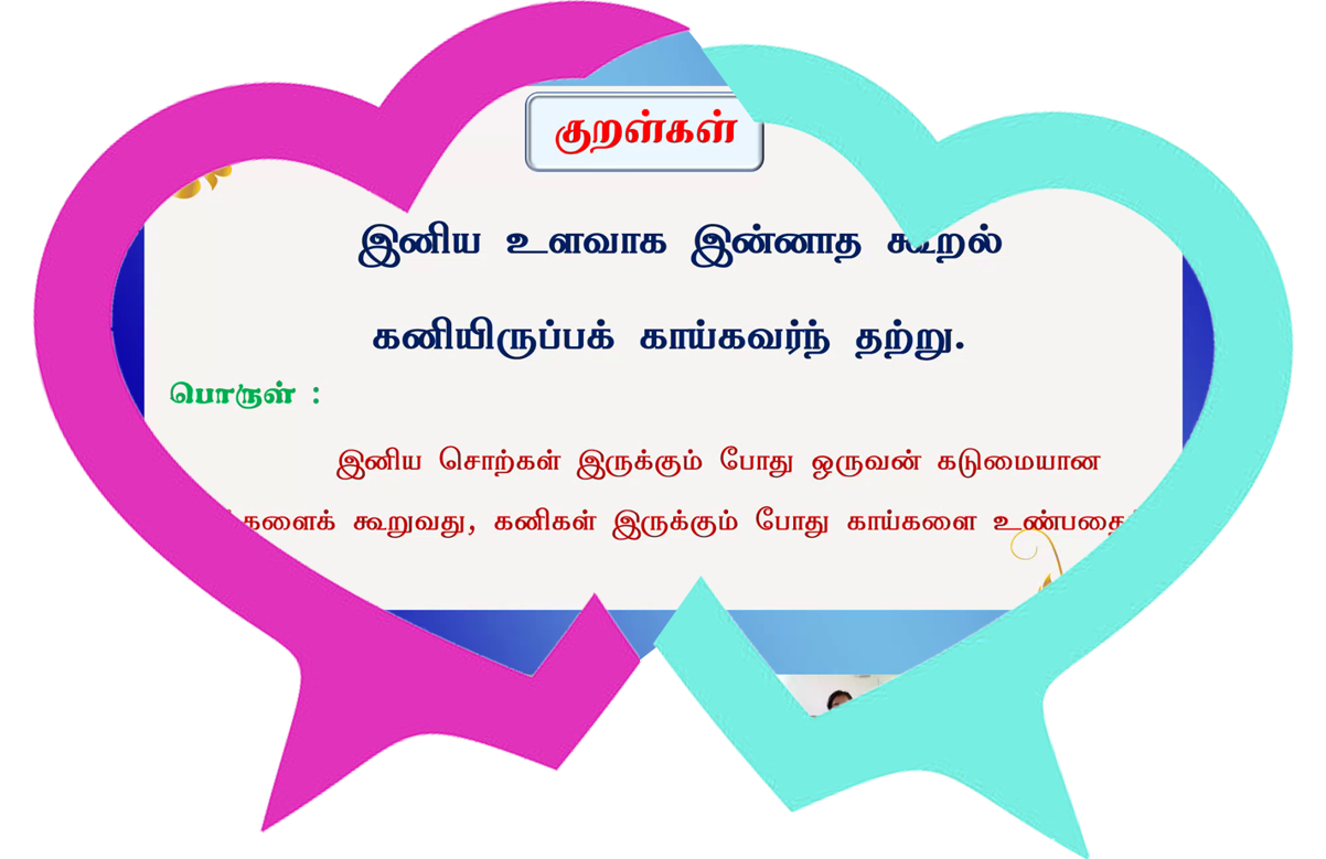 உலகப்பொதுமறையாம் திருக்குறளில் உள்ள அறக்கருத்துகளை மாணவர்களுக்கு எளிய முறையில் கற்பிக்கும் விதமாக, உலகத்தமிழ்க் கல்விக்கழகம் வள்ளுவம் காட்டும் வாழ்வியல் என்னும் தலைப்பில் சிறப்பு வகுப்புகளை ஏற்பாடு செய்தது. அதற்கான முதல் வகுப்பு இன்சொல் பேசுதல் என்ற தலைப்பில் நடைபெற்றது. அதில் மாணவர்கள் பலர் ஆர்வத்துடனும் உற்சாகத்துடனும் கலந்து கொண்டனர். மழலை மொழியும், குறளின் பெருமையும் ஓங்கி ஒலித்தன! அன்பின் அடிநாதமான இன்சொல்லினைக் கற்றுக்கொடுத்ததில் ஆசிரியருக்கும் மிகுந்த மகிழ்ச்சி! மேலும் மாணவர்கள் தங்கள் நண்பர்களையும் வகுப்பில் இணையச்செய்தது கூடுதல் மகிழ்ச்சி! இந்த வகுப்பின் முடிவில் மாணவர்கள், வள்ளுவர் கூறியுள்ளது போல் இன்சொல் பேசுவோம் என்று உறுதிமொழி எடுத்துக்கொண்டனர்..